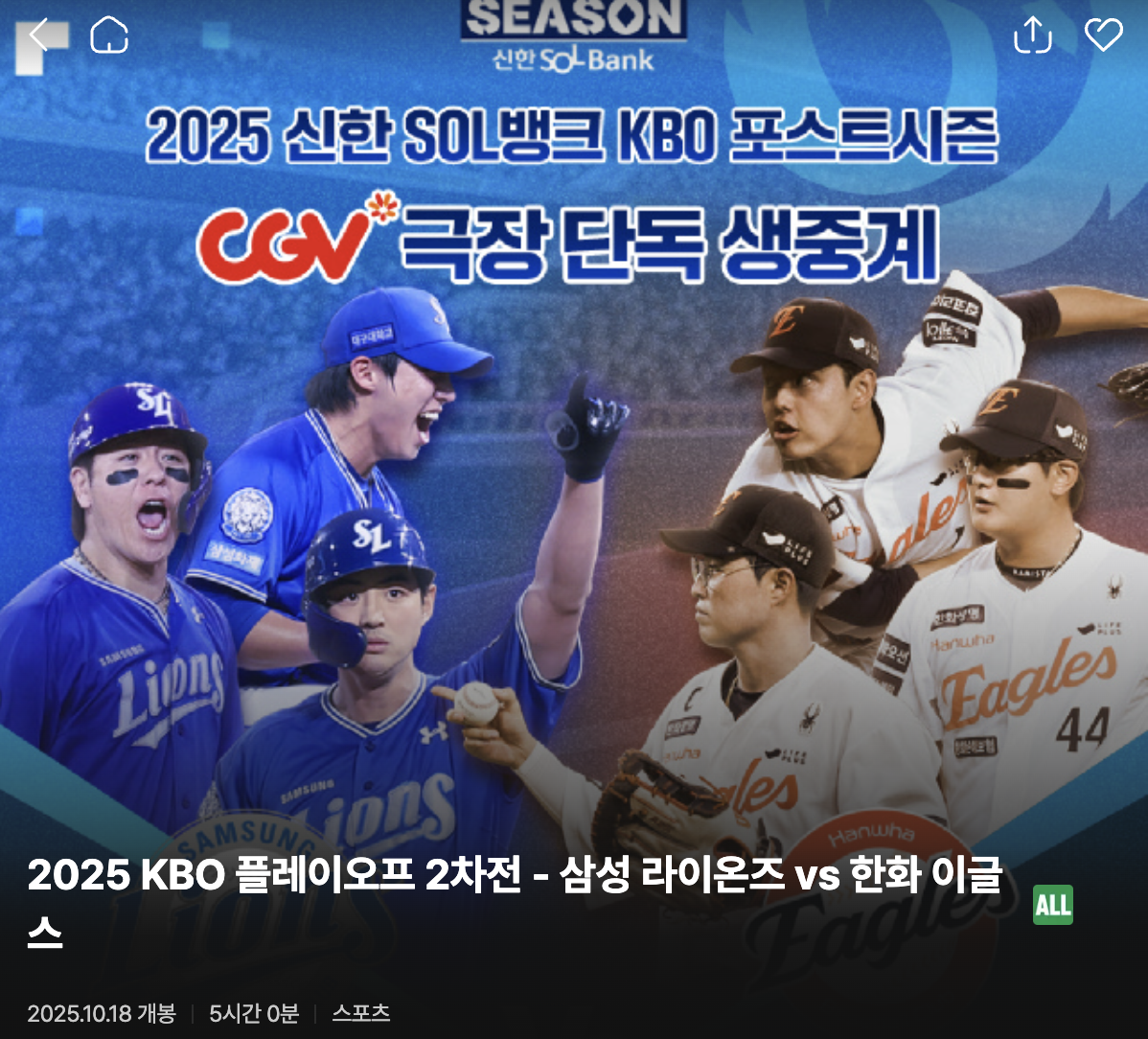 CGV 플레이오프 티켓 예매하기|2025 삼성 vs 한화 경기 생중계·상영관·일정 총정리